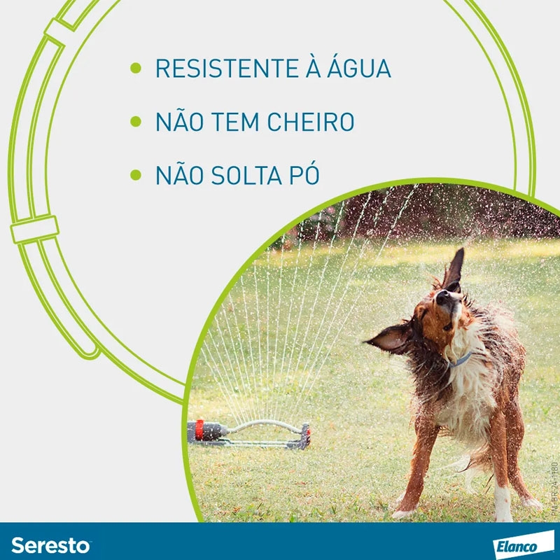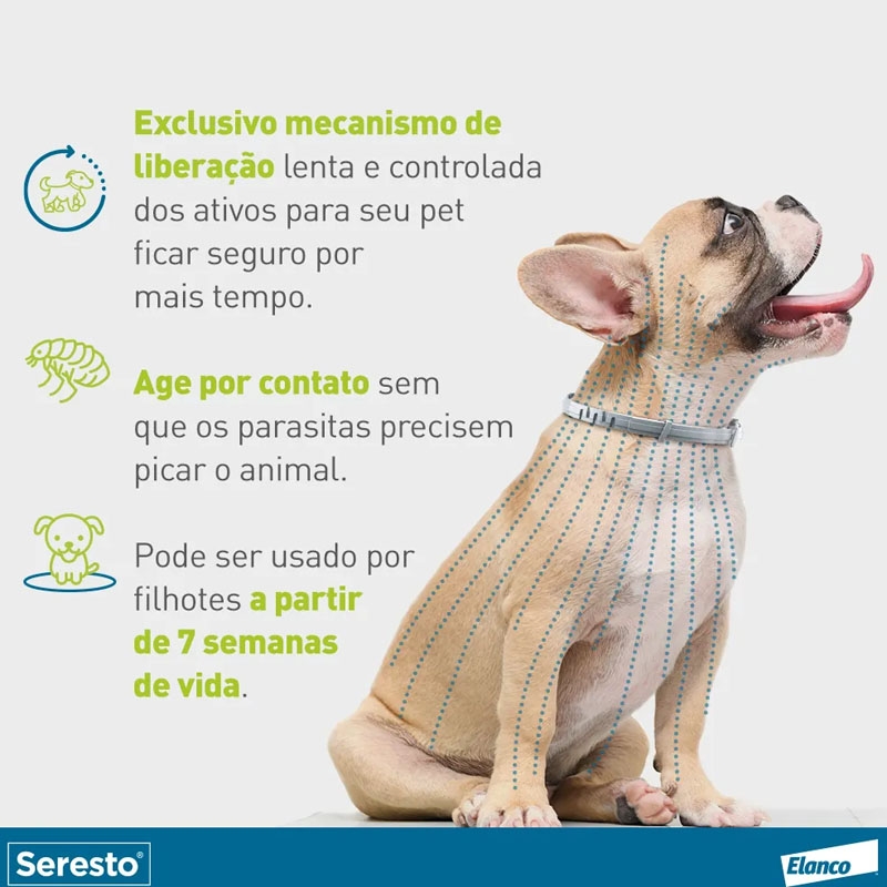 O Seresto libera doses adequadas de maneira constante por até 8 meses. Os princípios ativos são transferidos para a pele e o pelo do cão, proporcionando proteção contra carrapatos e pulgas, além de reduzir o risco de Leishmaniose.