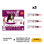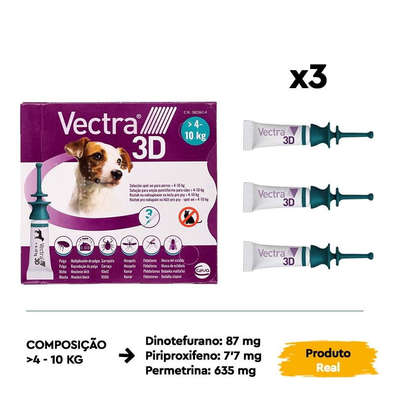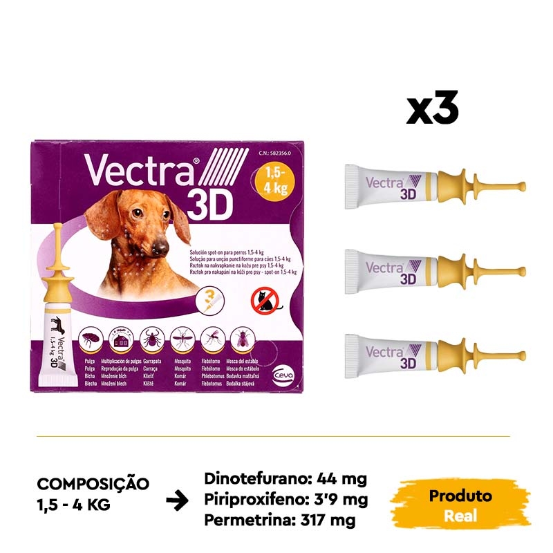 Uma única aplicação de VECTRA 3D oferece uma proteção duradoura durante todo o mês (4 semanas)*. Com cinco apresentações diferentes projetadas para cobrir os diferentes pesos dos cães, você pode encontrar a opção que melhor se adapta às necessidades específicas do seu animal. Este tratamento é adequado até mesmo para filhotes a partir de 7 semanas de idade ou com mais de 1,5 kg de peso.