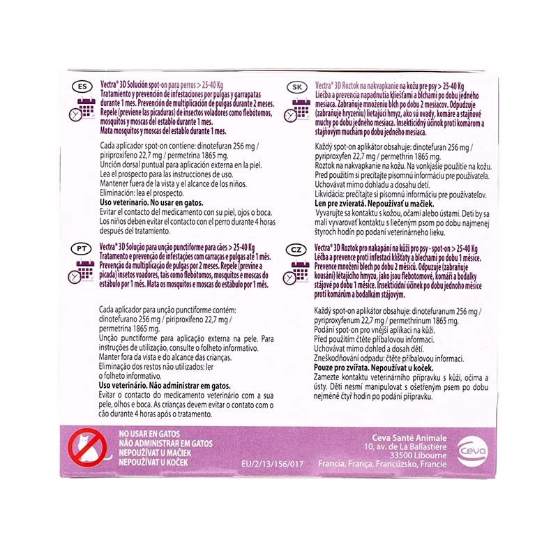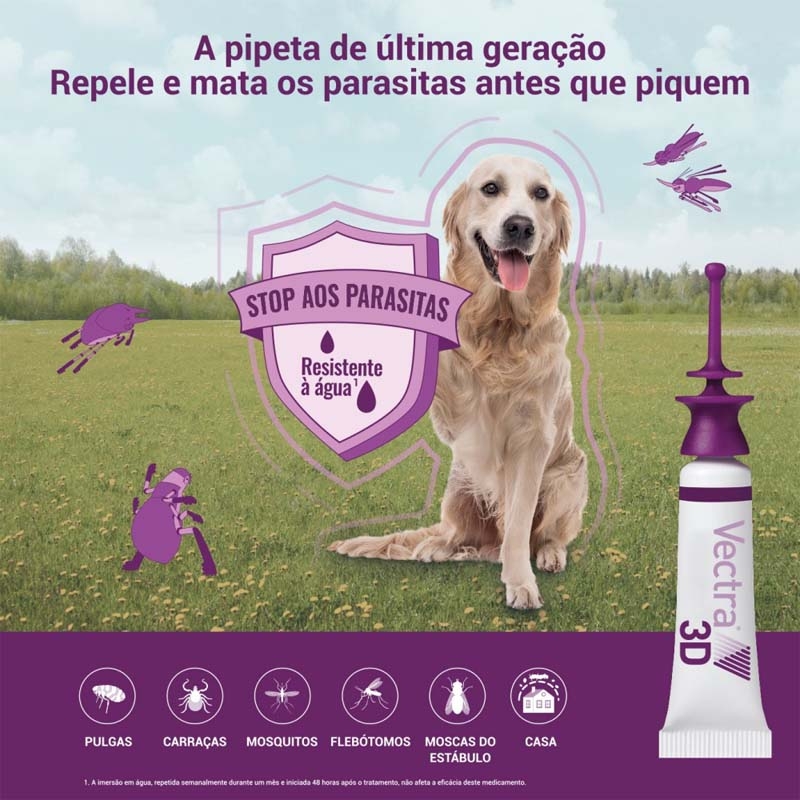 No caso da mosca estável, VECTRA 3D não apenas as repele e mata, mas também protege contra suas picadas durante todo um mês, oferecendo uma proteção completa contra uma variedade de parasitas para manter a saúde e o bem-estar do seu cão.