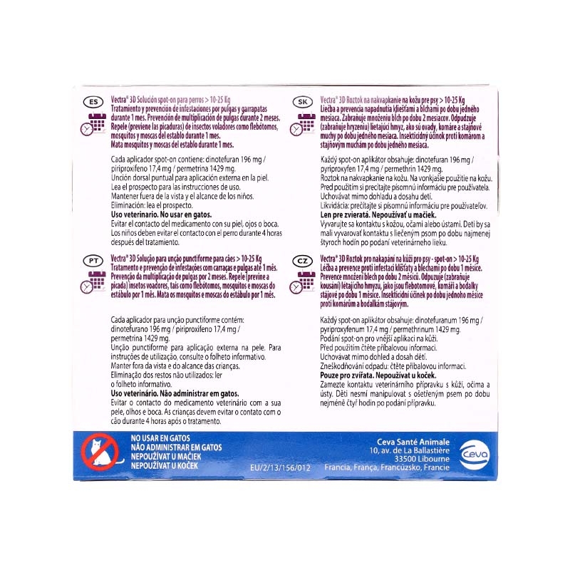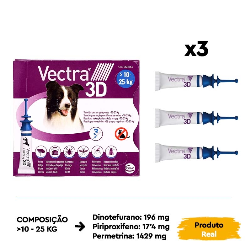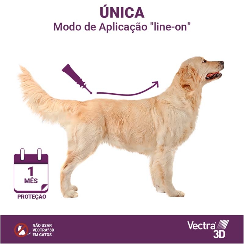 Com seu aplicador inovador e patenteado, VECTRA 3D se espalha de maneira simples sobre a pele do seu cão, proporcionando uma proteção altamente eficaz contra os parasitas. Este produto atua quando os parasitas entram em contato com a pele e a pelagem do seu animal, impedindo que possam picar e se alimentar do sangue do seu cão.