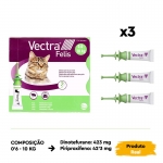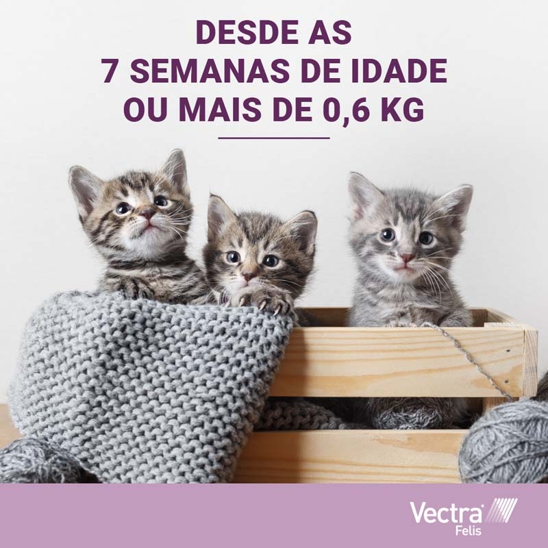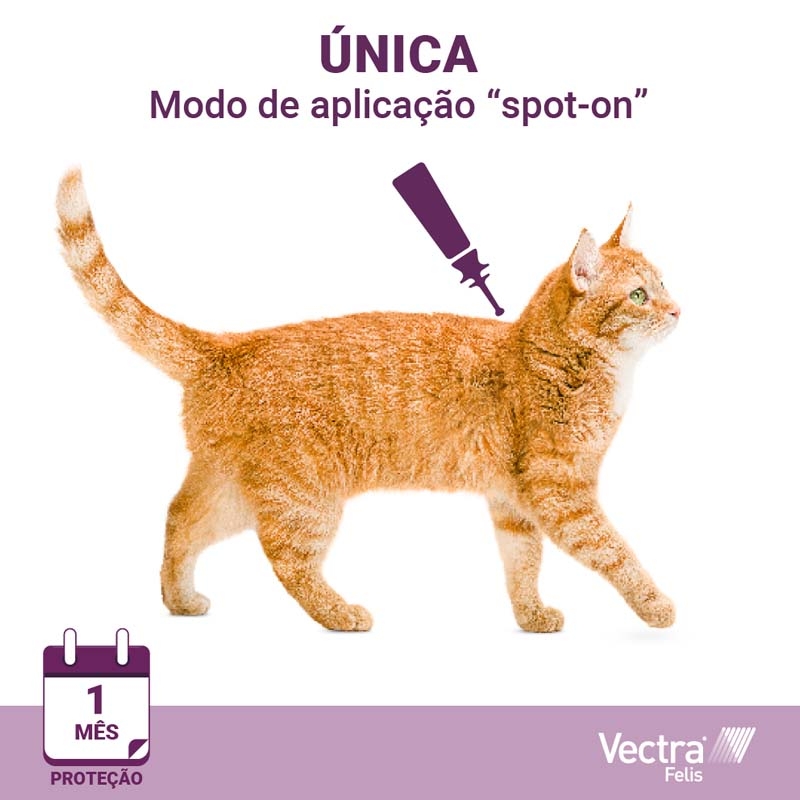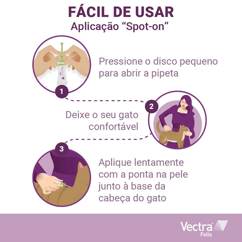 Para o uso de VECTRA Felis, são fornecidas instruções claras sobre como retirar o aplicador spot-on da embalagem e a maneira adequada de aplicá-lo na base da cabeça do gato para uma absorção ótima. É importante observar que o produto não deve ser usado em gatos ou gatinhos com peso inferior a 0,6 kg ou com menos de 7 semanas de idade, assim como em casos de hipersensibilidade às substâncias ativas ou a qualquer excipiente.