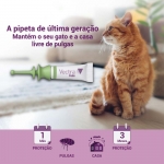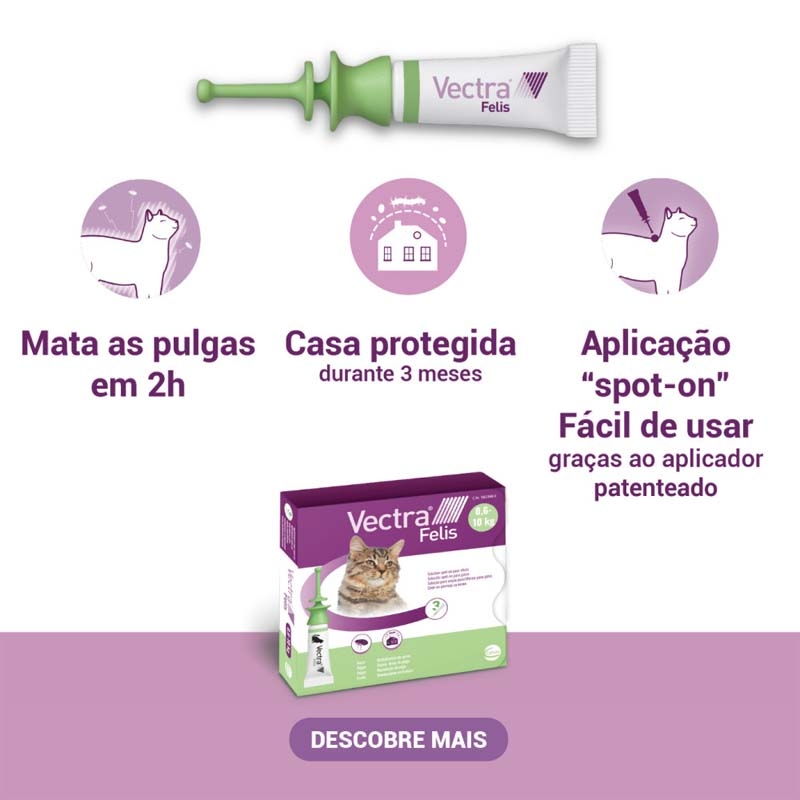 Em termos de eficácia, VECTRA Felis repele e elimina continuamente as pulgas adultas por um mês, com uma ação rápida que mata as pulgas em apenas 2 horas. Além disso, protege contra ovos e larvas de pulga, oferecendo uma defesa sólida para prevenir reinfestações por 3 meses. O aplicador patenteado com ponta arredondada assegura uma aplicação suave e sem danos à pele do gato.