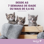 A pipeta antiparasitária VECTRA Felis, projetada para gatos a partir de 0,6 kg ou com mais de 7 semanas de idade, não apenas repele e elimina as pulgas por um mês, mas também age contra ovos e larvas de pulga, oferecendo uma proteção estendida de 3 meses para evitar possíveis reinfestações em casa.