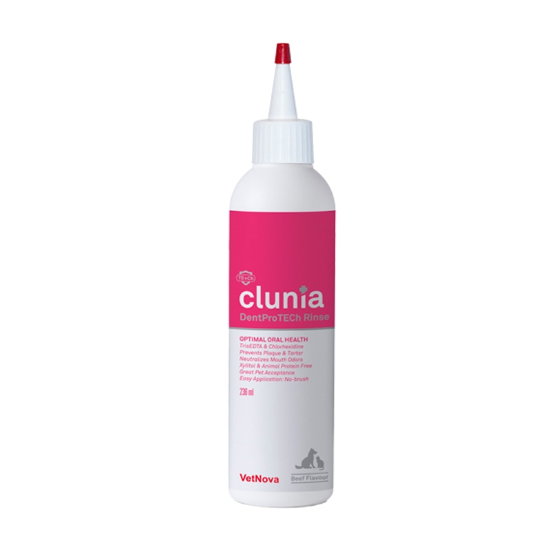 A solução Vetnova Clunia DentProTECh Rinse é líquida, para cães e gatos, ajudando a manter saúde dental. Fórmula inovadora combate placa e tártaro, protege gengivas e proporciona hálito fresco.