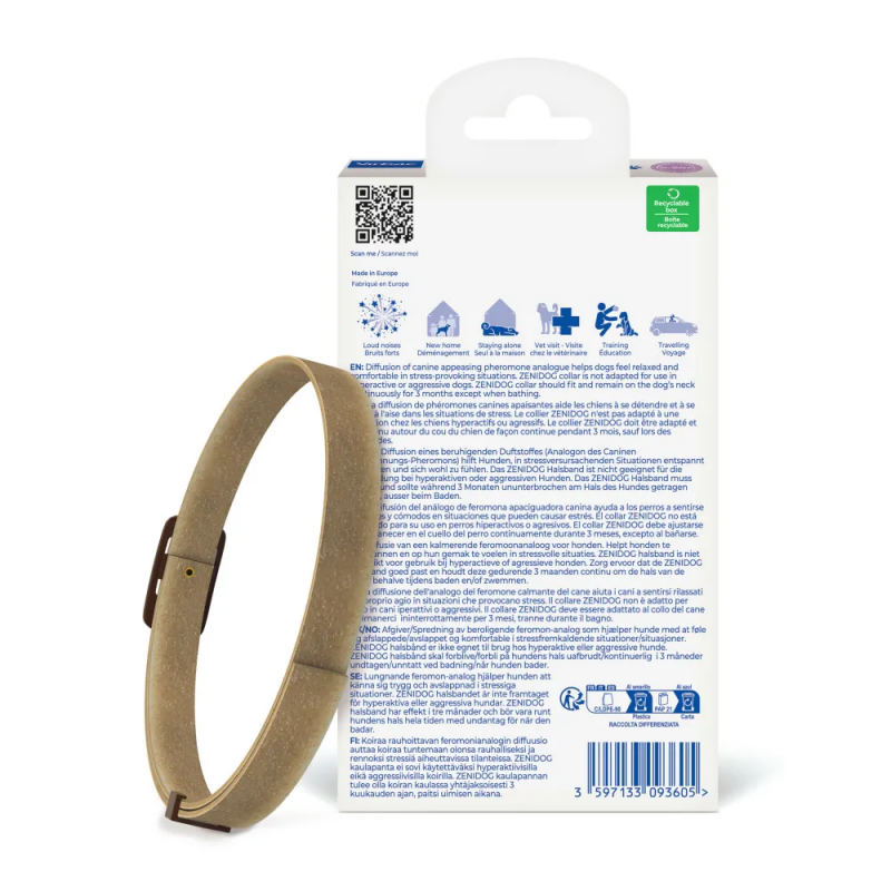 As feromonas apaziguadoras caninas são sinais naturais que transmitem segurança e tranquilidade. O Zenidog Collar reproduz estas feromonas maternas para ajudar o cão a relaxar e a adaptar-se melhor ao seu ambiente.