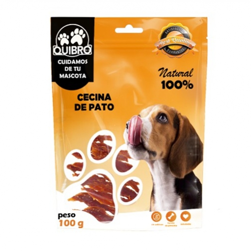 La cecina de pato para perros es un snack natural elaborado con pato como ingrediente principal, ideal para ofrecer un premio sabroso y diferente. Su textura semiseca facilita la masticación y la convierte en una opción práctica para perros de todos los tamaños, tanto como recompensa diaria como en momentos especiales.