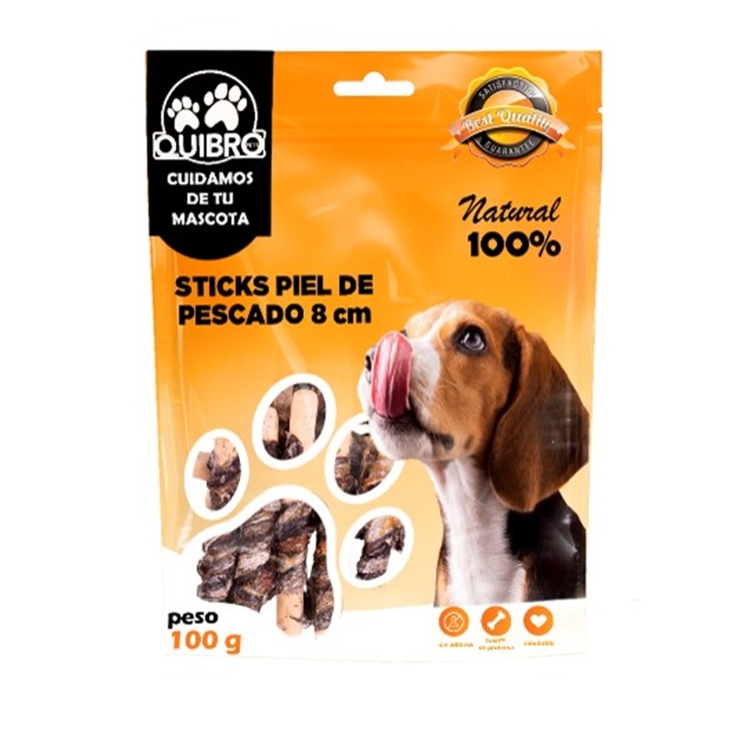 Ingredientes: Piel de pescado, harina de trigo, almidón, aceite vegetal, glicerina, sal, sorbato de potasio.