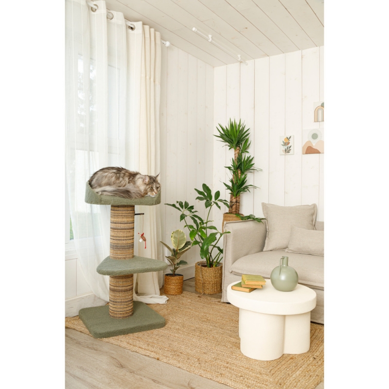 El rascador árbol para gatos Boreal Zolux color verde es una opción completa y estable, pensada especialmente para gatos grandes o de edad avanzada. Su diseño vertical, combinado con un escalón de acceso, facilita la subida a los distintos niveles, permitiendo que el gato disfrute del rascador con total comodidad y seguridad.