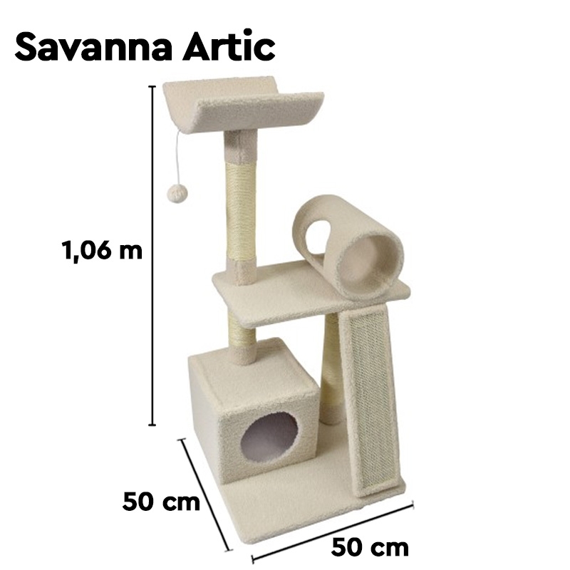 El rascador árbol para gatos Savanna Artic de Nayeco está diseñado para ofrecer un espacio completo de juego, descanso y rascado, adaptado a las necesidades naturales del gato. Su estructura con diferentes alturas permite al felino explorar y observar su entorno desde distintas perspectivas, estimulando su curiosidad y su instinto explorador.