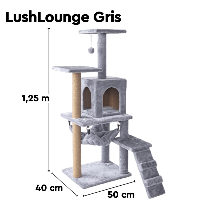 El Freedog LushLounge incorpora múltiples zonas de uso: una cómoda cueva para descansar o esconderse, una hamaca colgante perfecta para momentos de relax, pelotas de juego que estimulan la interacción, una plataforma elevada desde la que el gato puede observar su entorno y una rampa de acceso que facilita la subida y bajada.