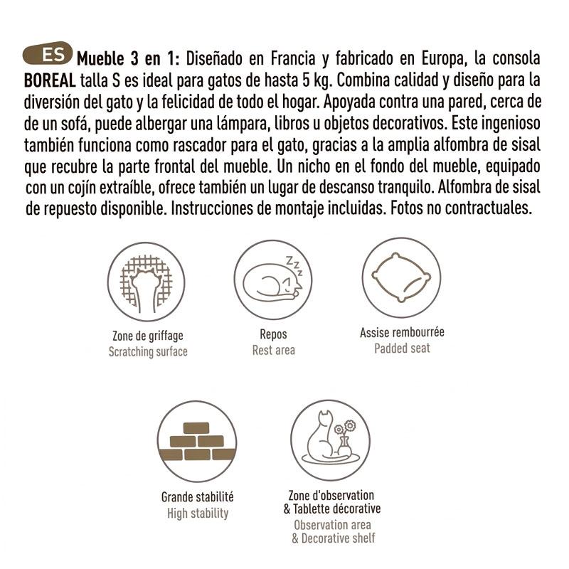 La mesa consola Boréal está diseñada en tamaño S, adecuada para gatos de hasta 5 kg. Su estructura estable y bien equilibrada proporciona seguridad durante el uso diario, permitiendo al gato subir, rascar o descansar con total tranquilidad.