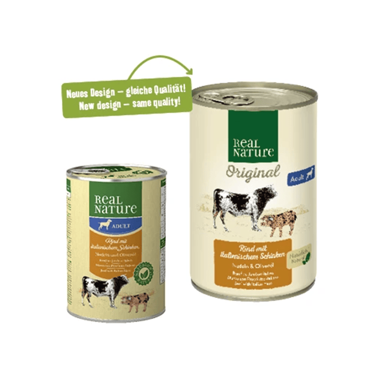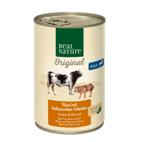 La receta de Ternera y Jamón de Real Nature es una combinación deliciosa y nutritiva, ideal para perros adultos que necesitan una fuente de proteínas de alta calidad. Con un 50% de carne de vacuno y 18% de jamón italiano de cerdo, esta receta no solo es sabrosa, sino también rica en nutrientes esenciales. Acompañada de tagliatelles y aceite de oliva, esta comida húmeda proporciona una digestión ligera y un sabor excepcional.