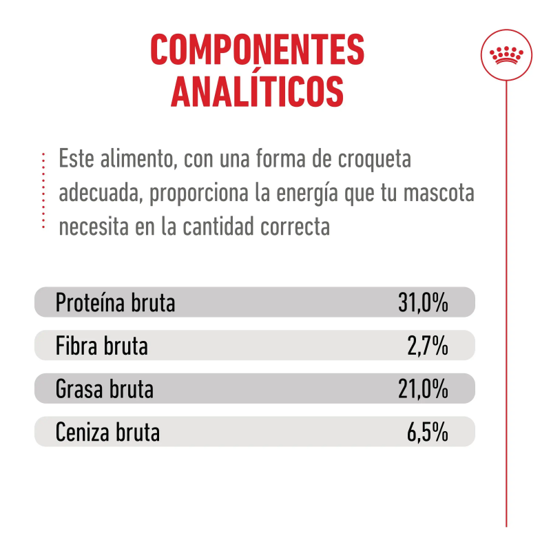 Componentes analíticos: Proteína bruta 31%, grasa bruta 21%, fibra bruta 2,7%, ceniza bruta 6,5%, fósforo 0,6%, ácido linoleico 4,5%, beta-caroteno 17 mg/kg, ácidos grasos EPA y DHA 0,7%, energía metabolizable 4.216 kcal/kg.