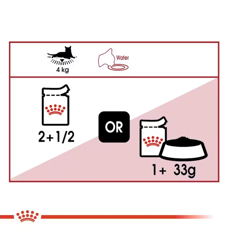 Cantidades recomendadas: solo sobres/día: 3 kg: 2 · 4 kg: 2,5 · 5 kg: 3 · 6 kg: 3,5. En alimentación mixta: 1 sobre + croquetas/día: 3 kg: 20-23 g · 4 kg: 29-34 g · 5 kg: 37-44 g · 6 kg: 45-53 g.