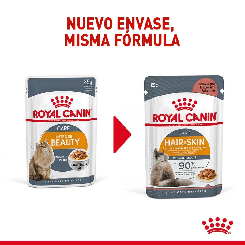 Comida húmeda para gatos adultos en salsa, formulada para realzar la belleza del pelaje y mantener una piel sana. Con omega 3 y omega 6 para un brillo intenso, bajo contenido en grasa para el control del peso y apoyo a la salud urinaria.