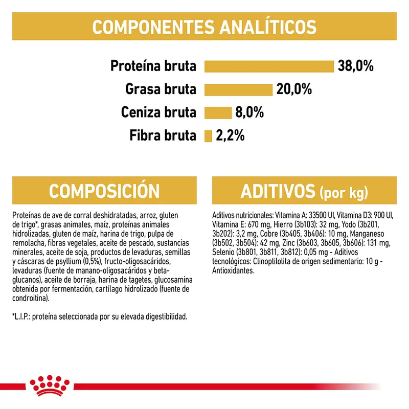 Ingredientes: proteína de ave deshidratada, arroz, harina de trigo, grasa animal, aislado de proteína vegetal, trigo, proteína animal hidrolizada, cebada, gluten de maíz, pulpa de remolacha, aceite de pescado, aceite de soja, minerales, psyllium, aceite de borraja, harina de tagetes, glucosamina, condroitina.