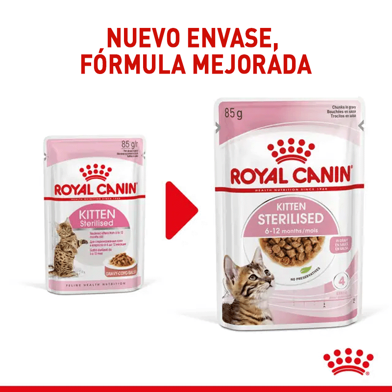 Esta comida húmeda para gatitos esterilizados está formulada para acompañar la etapa de crecimiento de los 6 a 12 meses. Sus bocaditos en salsa ayudan a mantener una buena aceptación, aportan hidratación y se adaptan al paladar de los felinos más exigentes tras la esterilización.