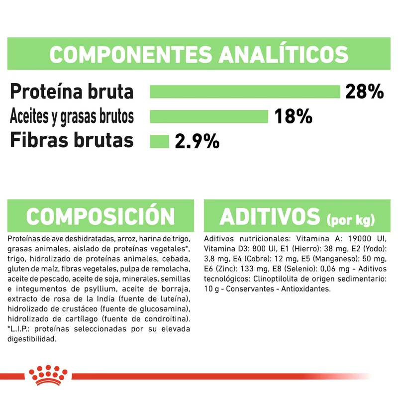 Ingredientes: proteína de ave deshidratada, arroz, harina de trigo, grasa animal, aislado de proteína vegetal, trigo, proteína animal hidrolizada, cebada, gluten de maíz, lignocelulosa, pulpa de remolacha, aceite de pescado, aceite de soja, minerales, psyllium, aceite de borraja, harina de tagetes, glucosamina, condroitina.
