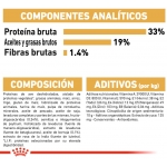Componentes analíticos: proteína bruta 33,0%, grasa bruta 19,0%, ceniza bruta 7,8%, fibra bruta 1,4%, omega 3 0,88%, EPA/DHA 0,35%.