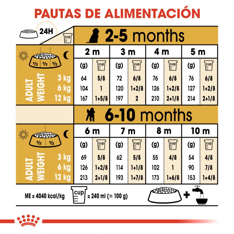 Ajustar según edad, actividad y desarrollo del cachorro. Conservar en lugar fresco y seco. Proporcionar siempre agua fresca y limpia.