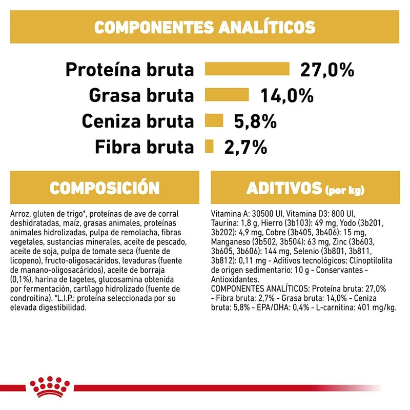 Ingredientes: proteínas de ave deshidratadas, maíz, gluten de trigo, grasas animales, trigo, gluten de maíz, proteínas animales hidrolizadas, arroz, fibras vegetales, pulpa de achicoria, minerales, aceite de soja, aceite de pescado, levaduras, fructo-oligosacáridos, psyllium, aceite de borraja, glucosamina, condroitina.