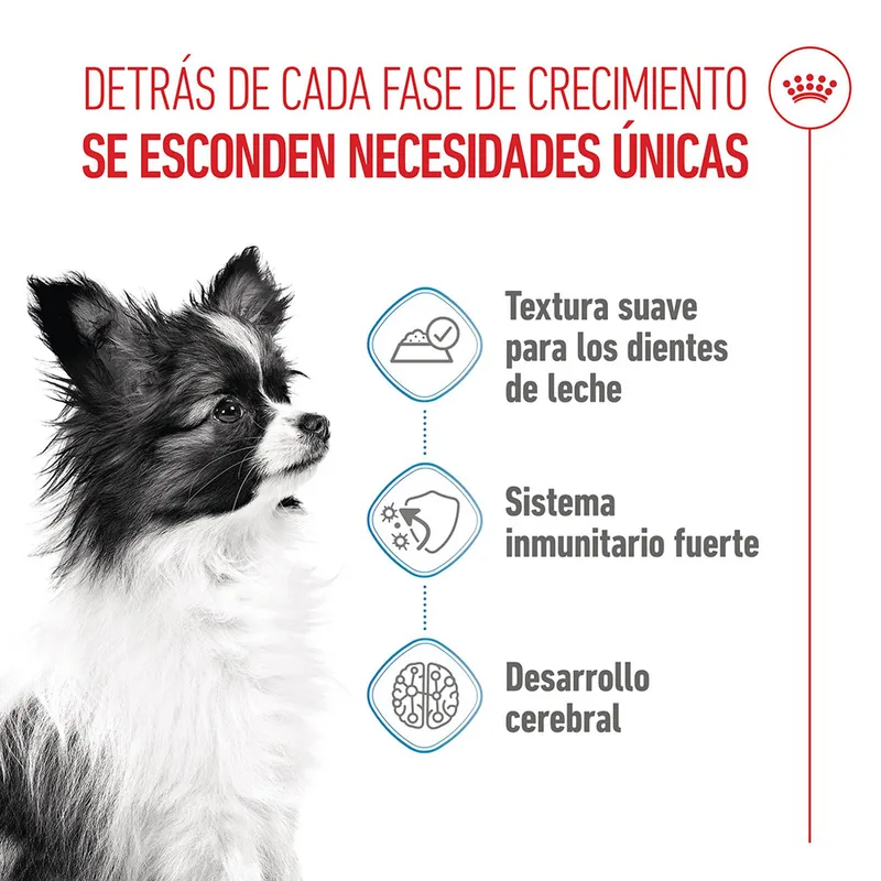 Comida húmeda para cachorros mini con textura suave, DHA y vitaminas que refuerzan el sistema inmunitario y favorecen el desarrollo cerebral.