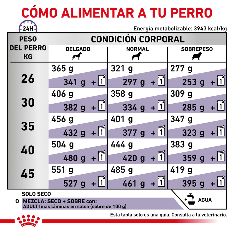 Las cantidades indicadas son orientativas y deben ajustarse según la condición corporal, el nivel de actividad y las recomendaciones de tu veterinario. Reparte la ración diaria en 2 o más tomas.