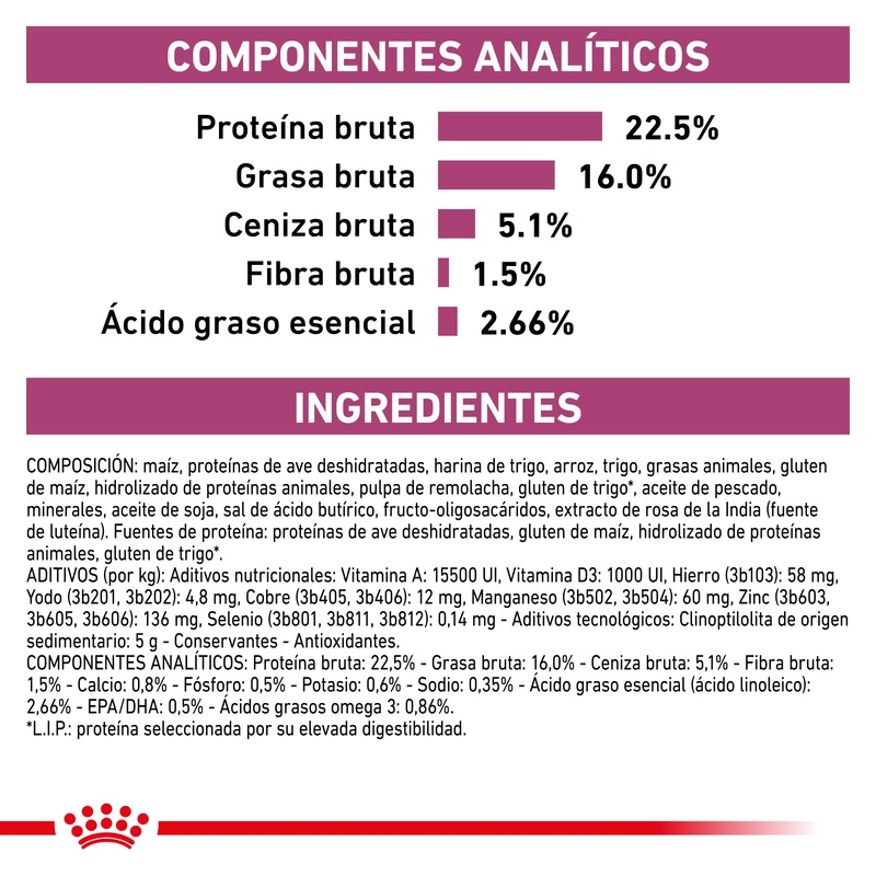 Composición: maíz, proteínas de ave deshidratadas, harina de trigo, arroz, trigo, grasas animales, gluten de maíz, hidrolizado de proteínas animales, pulpa de remolacha, gluten de trigo*, aceite de pescado, minerales, aceite de soja, sal de ácido butírico, fructo-oligosacáridos, extracto de rosa de la India (fuente de luteína). *L.I.P.: proteína seleccionada por su elevada digestibilidad.