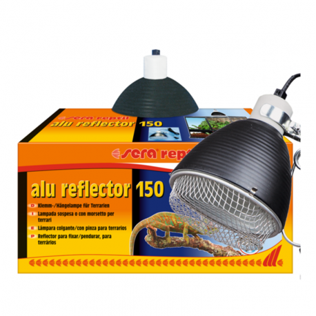 Sera Alu Reflector 150 es una lámpara colgante con pinza para terrarios que concentra la radiación lumínica y el calor, equipada con portalámparas cerámico E27, toma de tierra y cesto protector de aluminio para mayor seguridad.