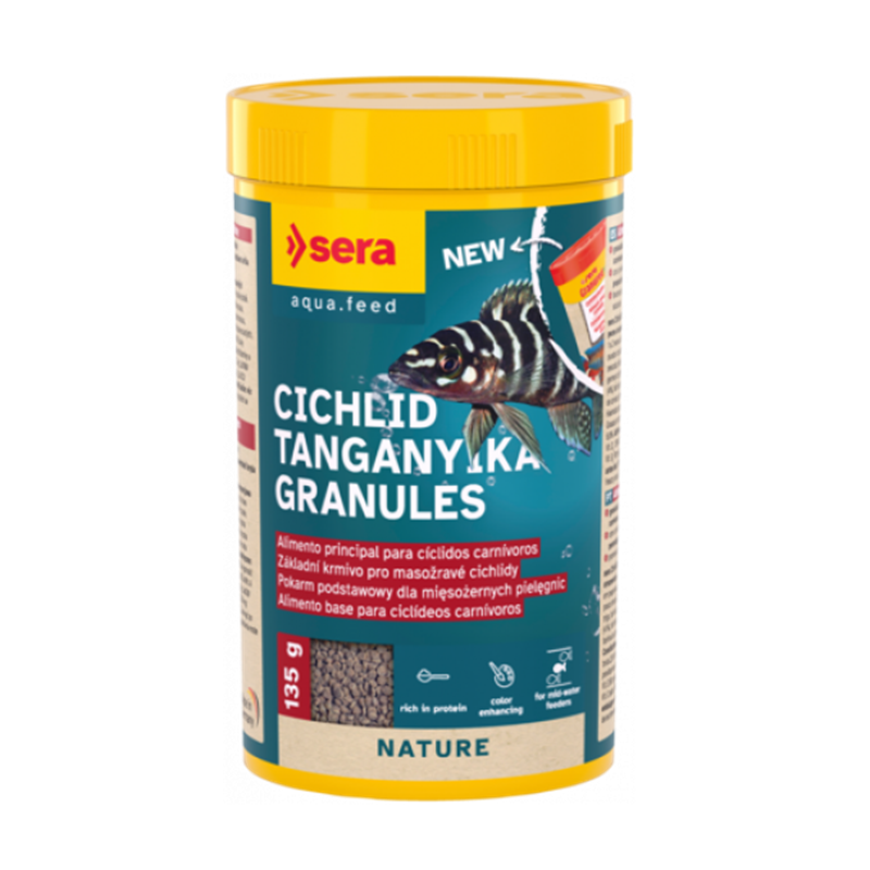 Sera Cichlid Tanganyika Granules Nature es un alimento completo diseñado para satisfacer las necesidades de los cíclidos carnívoros, especialmente aquellos procedentes del Lago Tanganica y especies con requerimientos proteicos elevados. Su granulado de hundimiento lento permite que los peces se alimenten de forma natural, sin generar restos que afecten a la calidad del agua.