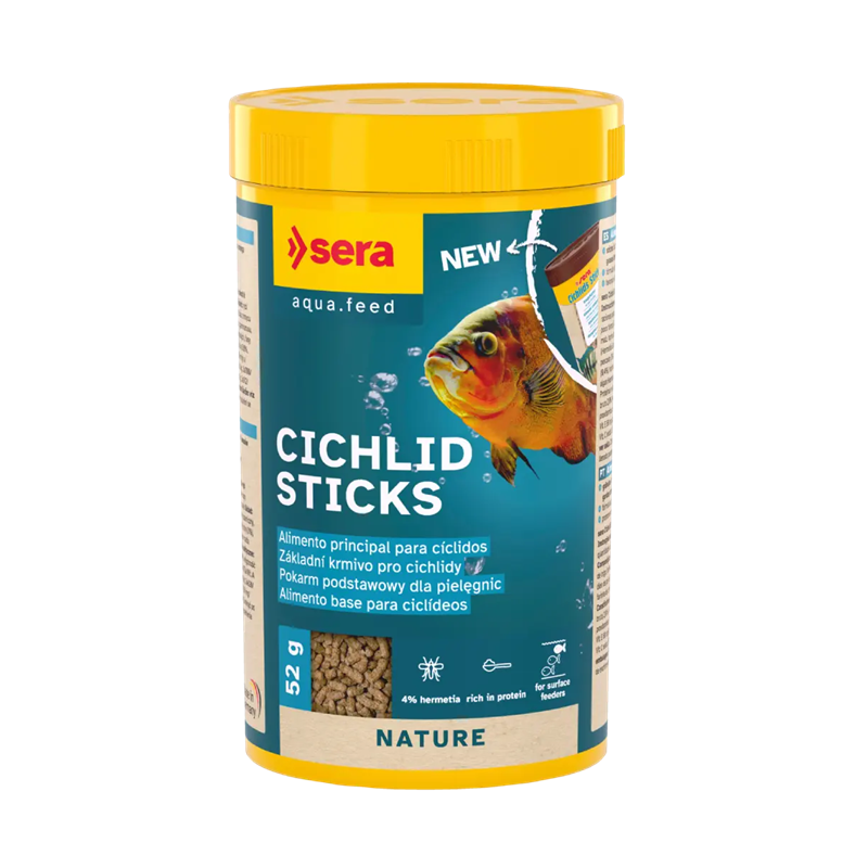 Sera Cichlids Sticks Nature es un alimento completo en sticks flotantes especialmente formulado para cíclidos omnívoros de gran tamaño y otros peces grandes, con proteínas de alta calidad, ácidos grasos Omega y harina de insectos para una nutrición natural y equilibrada.