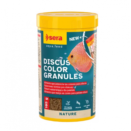 Sera Discus Color Granules Nature es un granulado blando potenciador del color, diseñado para intensificar de forma natural la tonalidad de los peces disco gracias a ingredientes premium como krill, gammarus y astaxantina de origen natural.