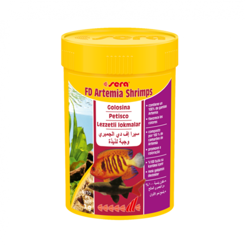 Sera FD Artemia Shrimps es una golosina premium compuesta exclusivamente por gambas Artemia liofilizadas, especialmente indicada para peces tropicales, cíclidos, bettas, discos, guppys y otros peces ornamentales, así como invertebrados de agua dulce y salada. Gracias a su elaboración mediante liofilización, conserva intactos sus nutrientes naturales y su atractivo sabor.