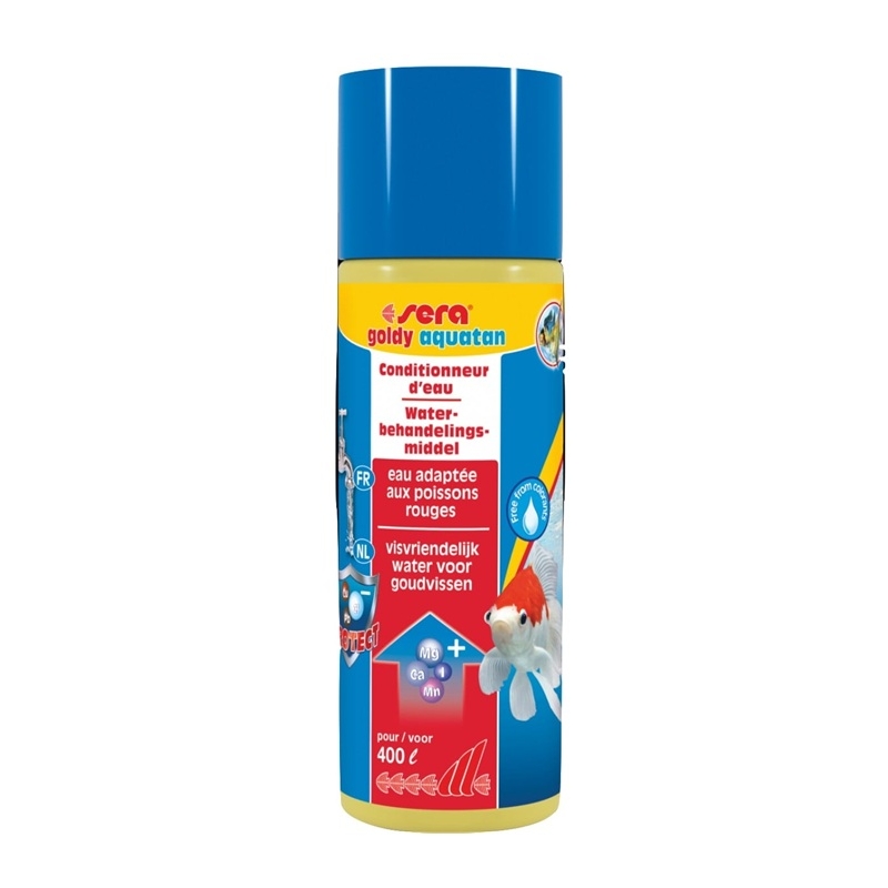 Sera Goldy Aquatan acondiciona de inmediato el agua del grifo, adaptándola a las necesidades de peces de agua fría como carpas doradas, shubunkin, sarasa o cola de velo. Neutraliza al instante sustancias nocivas como cloro, cloramina, metales pesados y amoníaco, factores que pueden provocar estrés, irritación y problemas de salud en los peces.