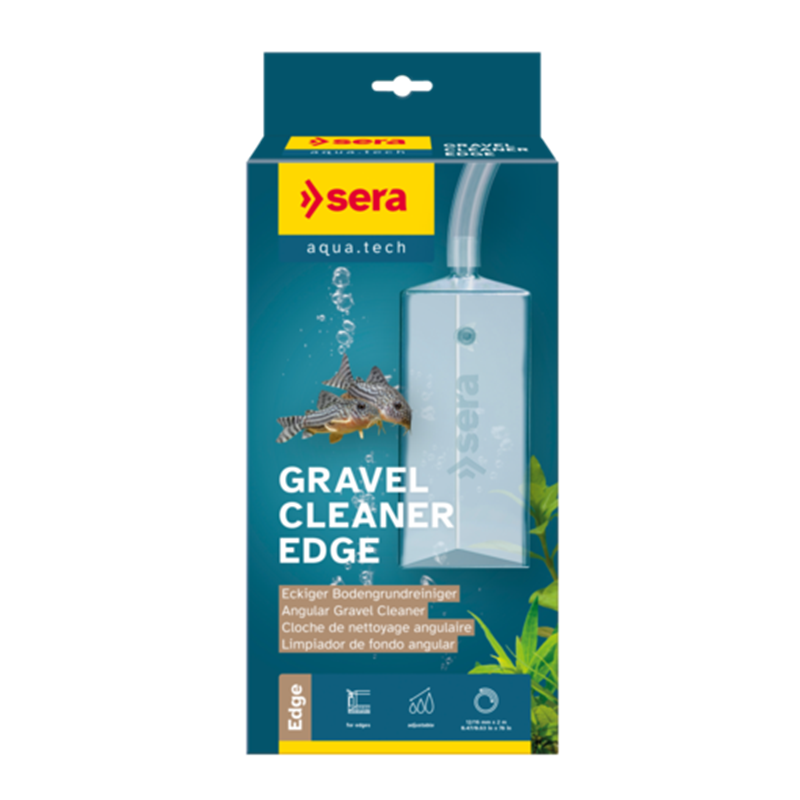 Sera Gravel Cleaner Edge es un limpiador de fondo angular diseñado para eliminar eficazmente los detritus acumulados en esquinas y bordes del acuario, con potencia de aspiración regulable para una limpieza precisa.