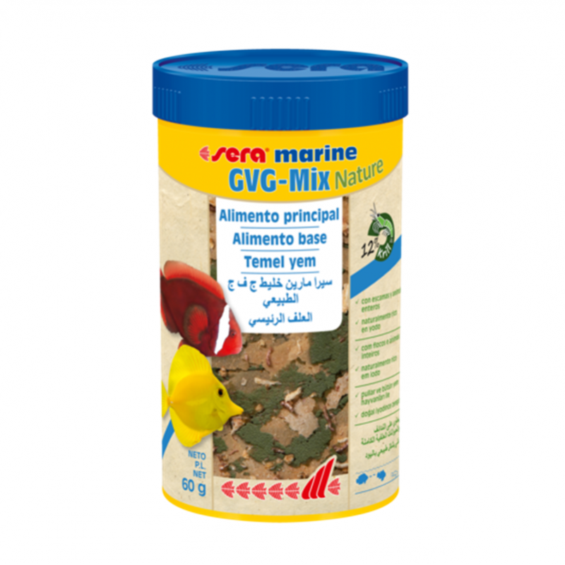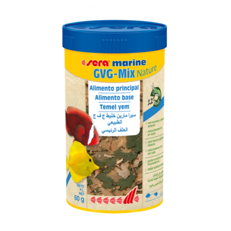 Sera Marine GVG-Mix Nature es un alimento principal en copos para peces de agua salada, elaborado con escamas y animales secos enteros como krill, dafnias y larvas de mosquito, que favorece la vitalidad, la coloración natural y una nutrición equilibrada.