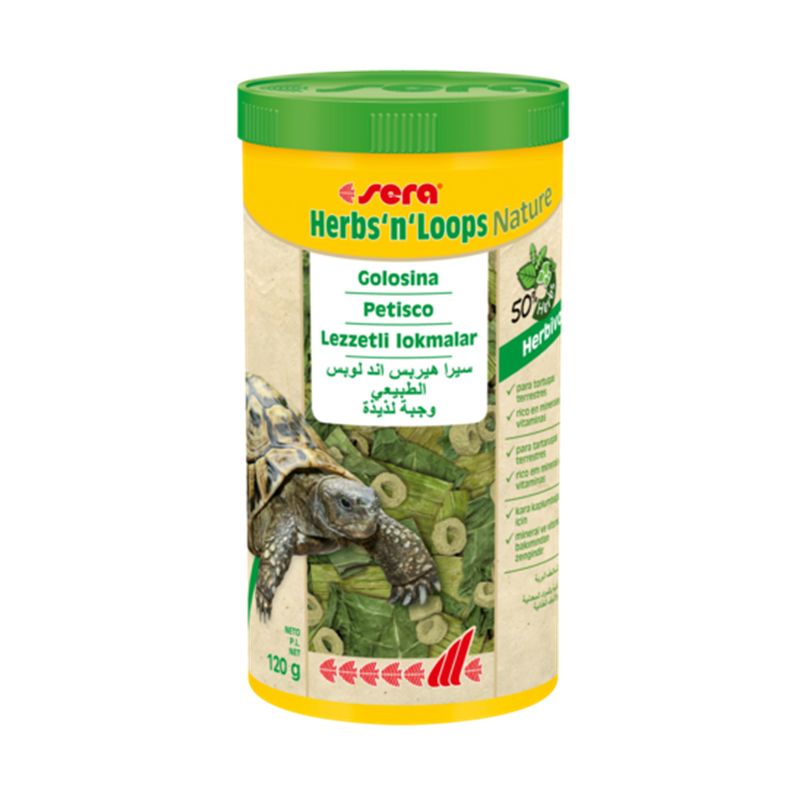 Sera Herbs’n’Loops Nature es una golosina natural para tortugas terrestres y otros reptiles herbívoros, elaborada con hierbas secas (50%) y anillos nutritivos para aportar variedad, reforzar las defensas y mejorar la vitalidad.