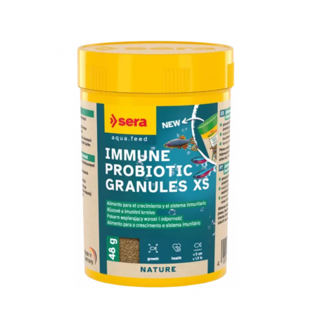 Sera Immune Probiotic Granules XS es un alimento completo probiótico en granulado fino, diseñado para peces ornamentales de hasta 5 cm. Favorece un crecimiento saludable, refuerza el sistema inmunitario y mejora la digestión desde las primeras etapas.