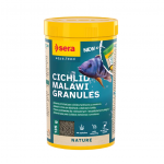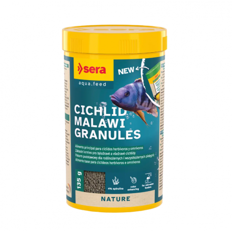 Sera Malawi Granules Nature es un alimento completo en gránulos de hundimiento lento, formulado para cíclidos con dieta basada principalmente en algas y vegetales, especialmente especies originarias de los lagos africanos como el Malawi.