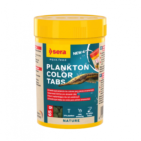 Sera Plankton Color Tabs Nature es un alimento completo en forma de pastillas que se hunden lentamente, diseñado para peces ornamentales que se alimentan en las capas inferiores del acuario, como loricáridos, lochas y otros peces de fondo, así como para diversos invertebrados de agua dulce y salada.