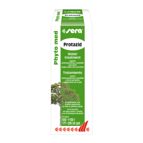 Sera Phyto med Protazid es un acondicionador de agua de origen vegetal formulado para combatir eficazmente Ichthyophthirius multifiliis, causante de la enfermedad del punto blanco, así como otros parásitos unicelulares de la piel en peces ornamentales.