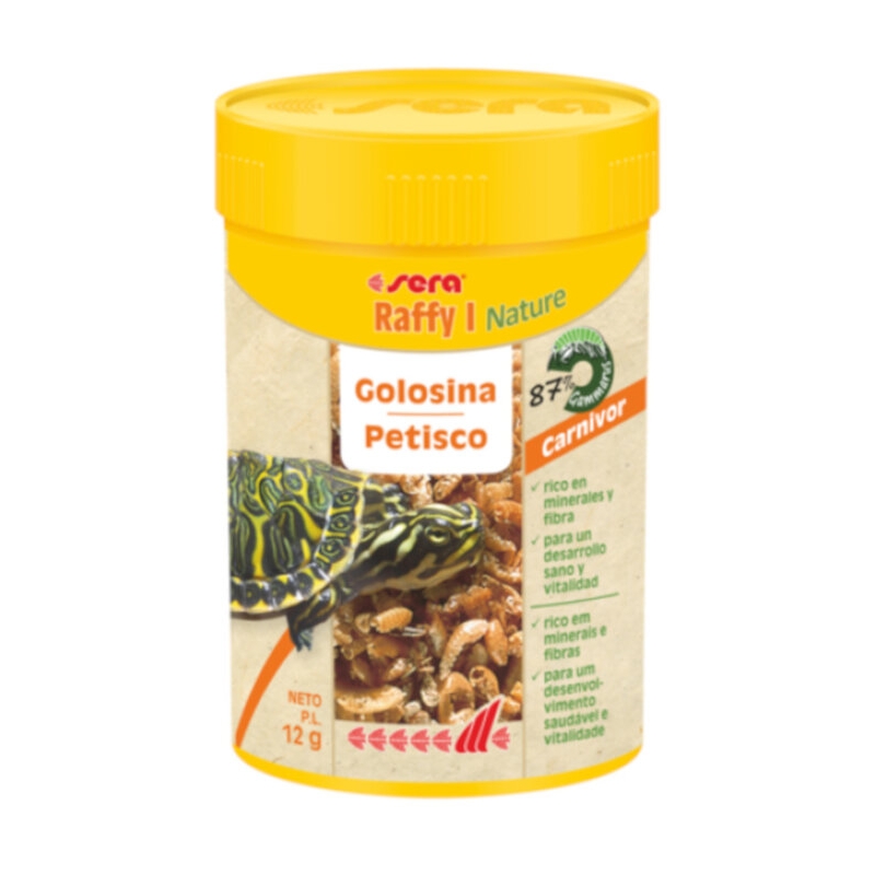 Sera Raffy I Nature es un alimento complementario diseñado para enriquecer la dieta de tortugas acuáticas y otros reptiles carnívoros. Su composición está basada en ingredientes de origen animal cuidadosamente seleccionados, que reproducen de forma fiel la alimentación natural de estas especies.