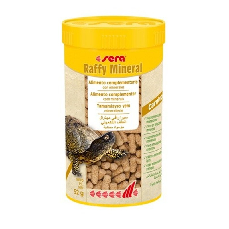Sera Raffy Mineral es un alimento complementario en gránulos para reptiles carnívoros como tortugas acuáticas, con minerales y nutrientes esenciales para apoyar huesos, caparazón y defensas.