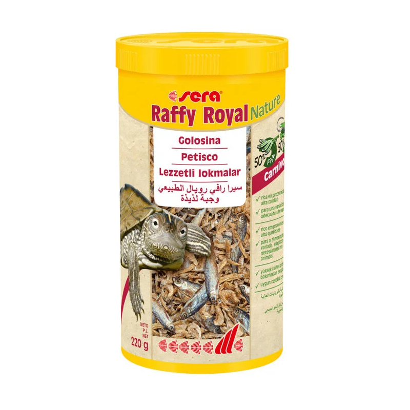 Sera Raffy Royal Nature es una golosina natural rica en proteínas elaborada con peces y gambas secados, ideal como snack para reptiles, tortugas acuáticas, anfibios y grandes peces depredadores. Aporta ácidos grasos omega, minerales y oligoelementos que favorecen la vitalidad y el desarrollo.