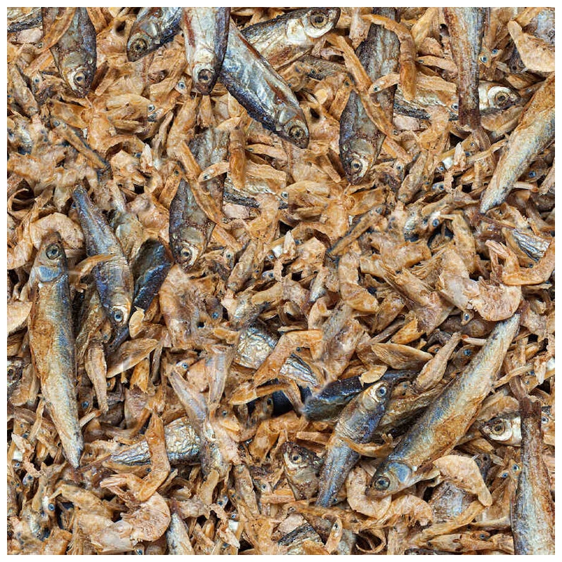 Este snack está compuesto exclusivamente por peces y gambas secados, cuidadosamente procesados para conservar su valor nutricional. Su textura y sabor intenso lo convierten en un alimento altamente apetecible, incluso para animales exigentes.