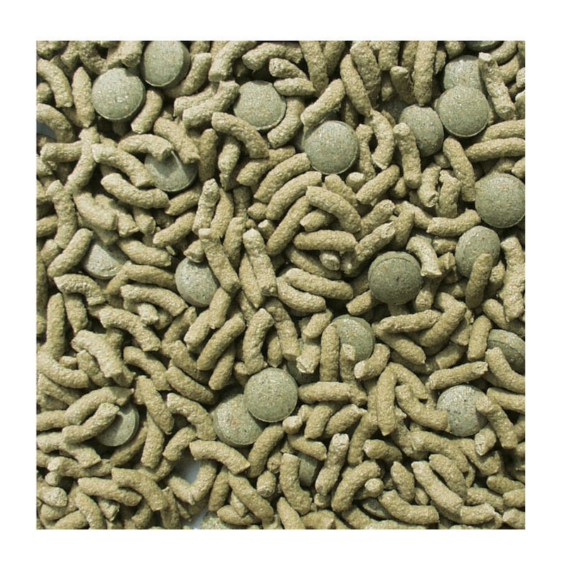 Composición: fécula de maíz, harina de trigo, hierbas, alfalfa, gluten de trigo, harina de pescado, algas marinas, ortigas, levadura de cerveza, zanahorias, espirulina, perejil, pimentón, huevo entero en polvo, aceite de pescado, espinaca, azúcar, gammarus, mejillón de labio verde en polvo y ajo.
