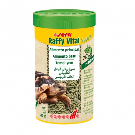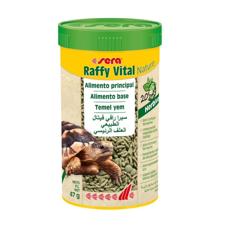 Sera Raffy Vital Nature es un alimento completo de origen vegetal para reptiles herbívoros como tortugas terrestres e iguanas, rico en fibra, vitaminas y minerales para apoyar digestión, defensas y caparazón.