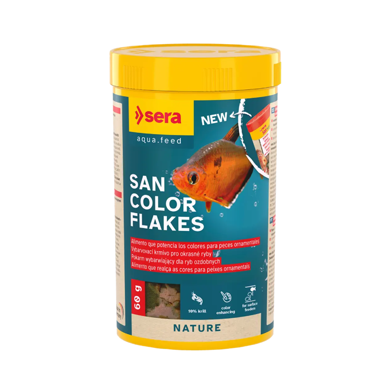 Sera San Color Flakes Nature es un alimento completo en copos para peces ornamentales que comen en la superficie, formulado para realzar el color natural con ingredientes como krill (10%) y Haematococcus (fuente de astaxantina). Sus escamas flotantes son muy palatables y ayudan a mantener el agua limpia.