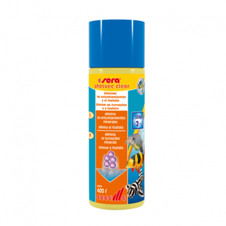 Sera Phosvec Clear elimina de forma inmediata los enturbiamientos del acuario y reduce el exceso de fosfato, ayudando a mantener un agua cristalina y libre de algas.