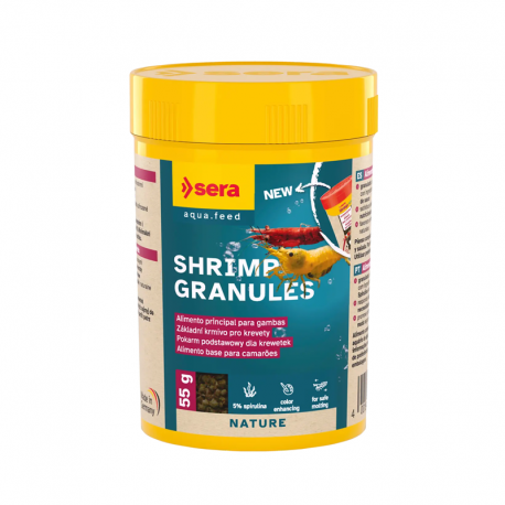 Sera Shrimps Nature es un alimento completo en forma de granulado que se hunde lentamente y conserva su forma en el agua, permitiendo que las gambas se alimenten con tranquilidad y de manera progresiva. Su fórmula, elaborada sin colorantes ni conservantes artificiales, imita el tipo de alimentación que las gambas encuentran en su entorno natural.